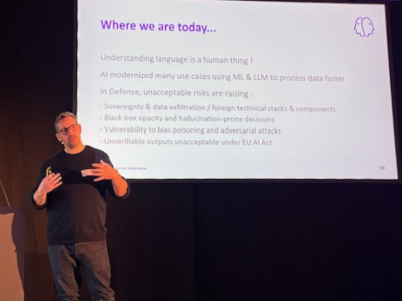 On stage in Germany, presenting Percipion™ to key defense industry executives and highlighting its strategic benefits for threat intelligence and resilience.