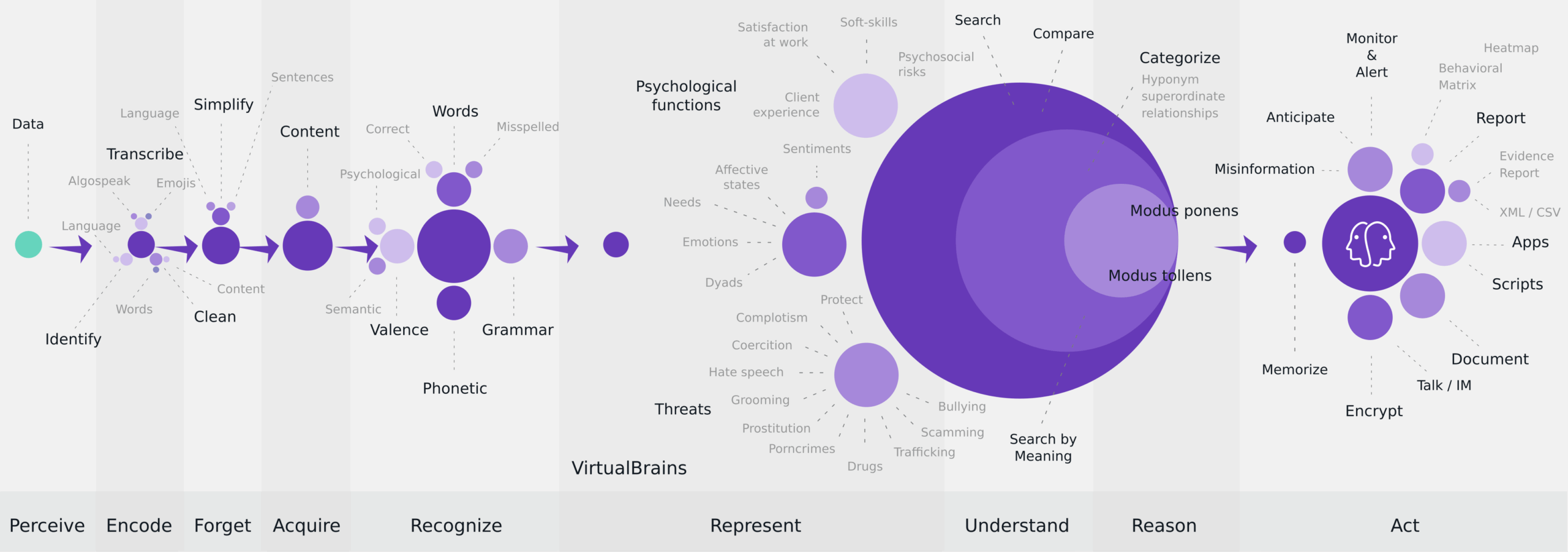 Compréhension du langage naturel, traitement des mots mal orthographiés, analyse grammaticale, conjugaison, identification des valences sémantiques et psychologiques et identification des liens d’hyponymie-superordination ; recherches simples et recherches par sens ; comparaison de documents ; évaluation des sentiments ; évaluation de la désinformation ; anticipation de la menace ; mémorisation d’informations